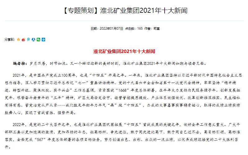 yd2333云顶电子游戏股份主板上市入选淮北矿业集团2021年十大新闻