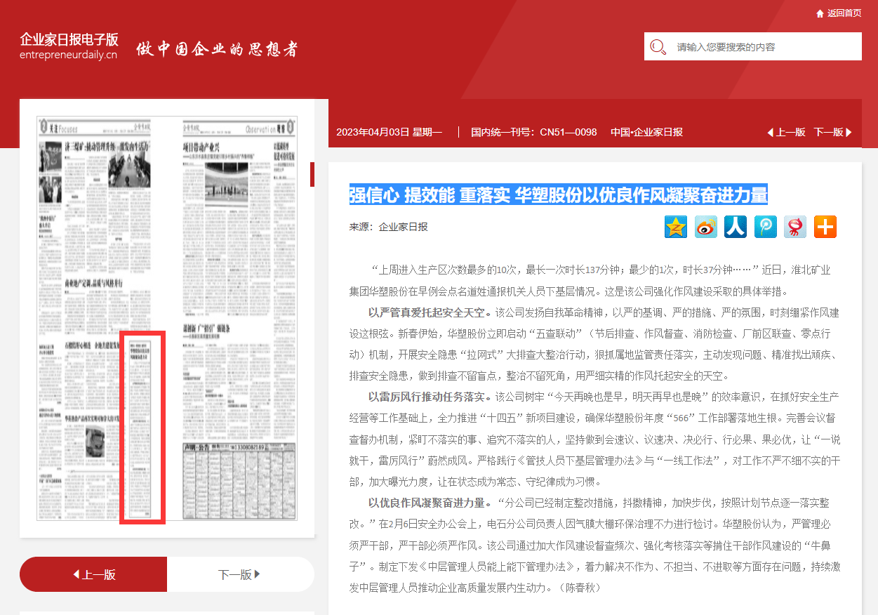 《企业家日报》4月3日三版:强信心 提效能 重落实 yd2333云顶电子游戏股份以优良作风凝聚奋进力量