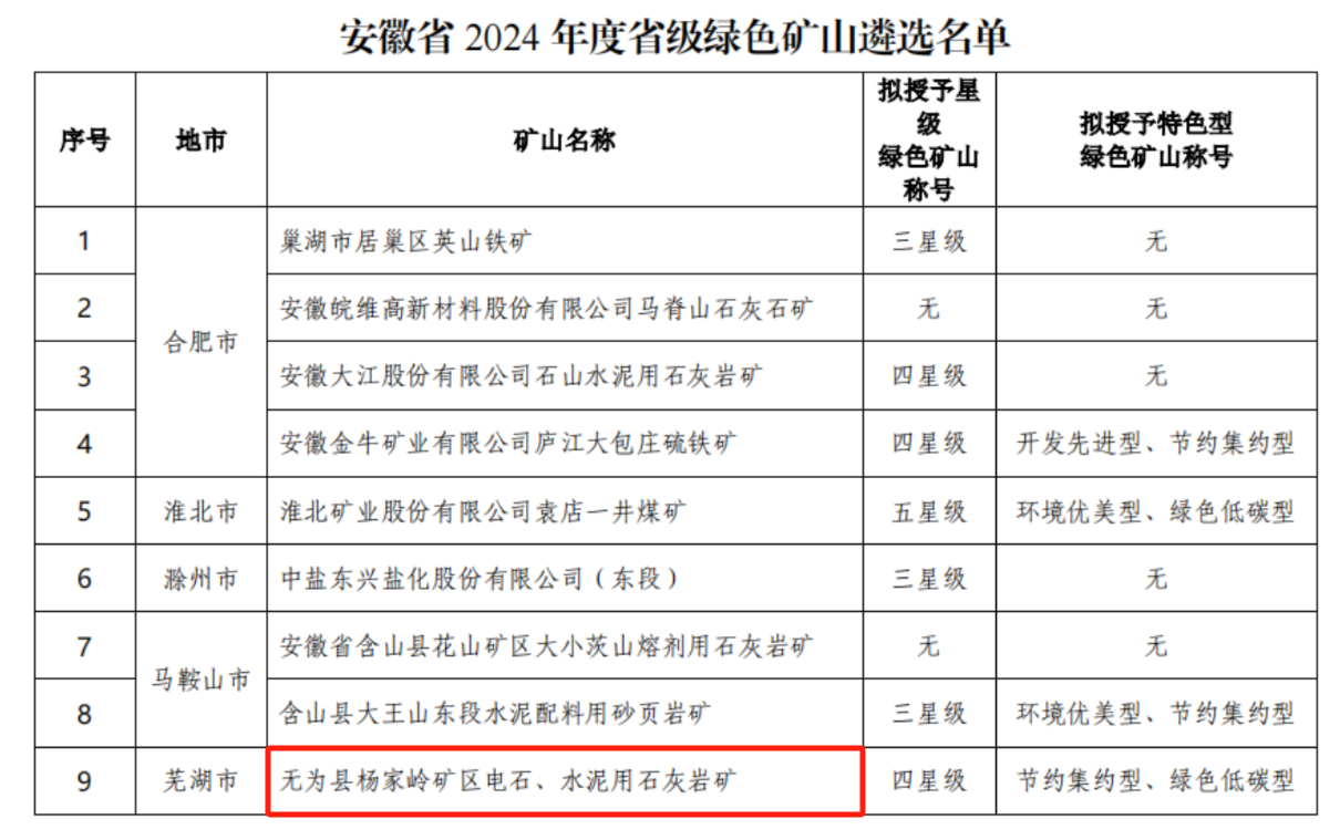 近日,安徽省自然资源厅公布了2024年省级绿色矿山名录,yd2333云顶电子游戏股份无为yd2333云顶电子游戏矿业电石、水泥石灰岩矿榜上有名,荣获“省级绿色矿山”,授予特色型绿色矿山“节约集约型、绿色低碳型”称号。这是继2024年7月yd2333云顶电子游戏股份获评“安徽省绿色工厂”,连续七次获得安徽省属企业“文明单位”,多次荣获“中国石油和化学工业文化建设先进单位”之后取得的又一项殊荣。